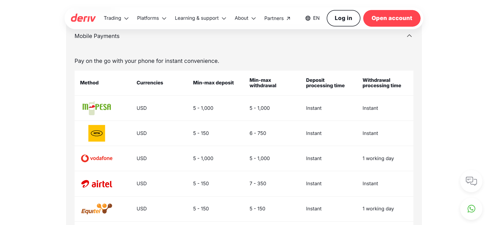 | Supports Mobile Money in eligible regions | Spreads vary by account type |
