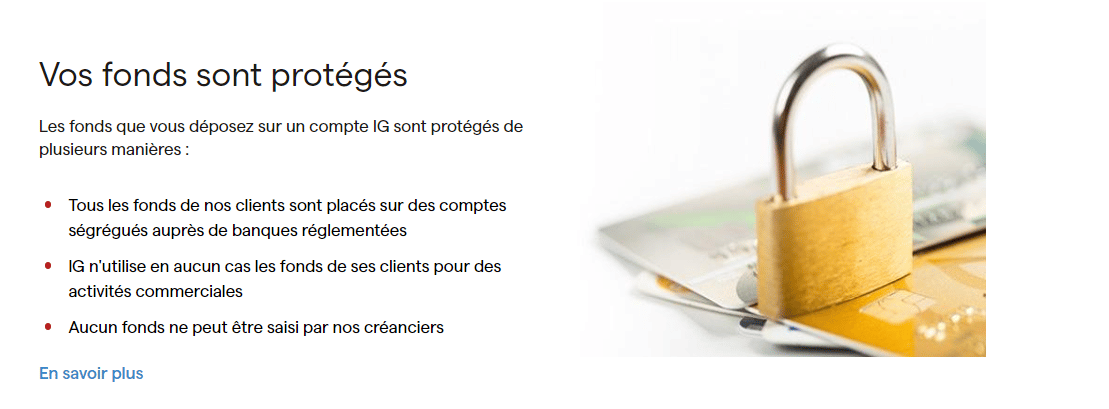 Oui, les fonds des clients IG sont détenus dans des comptes bancaires clients distincts (fiducie indépendante) dans des banques réglementées.