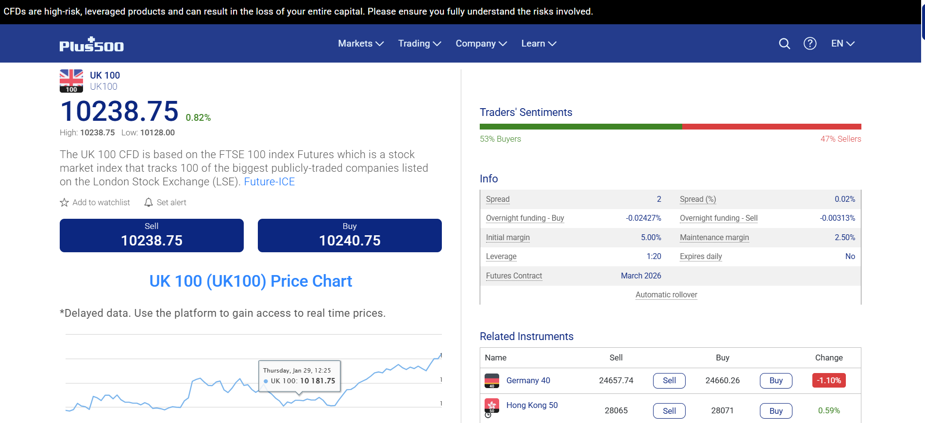 Yes, leverage is available. For UK retail traders, the FCA caps leverage at 20:1 for major indices like the FTSE 100. This means you only need a 5% margin to open a position.