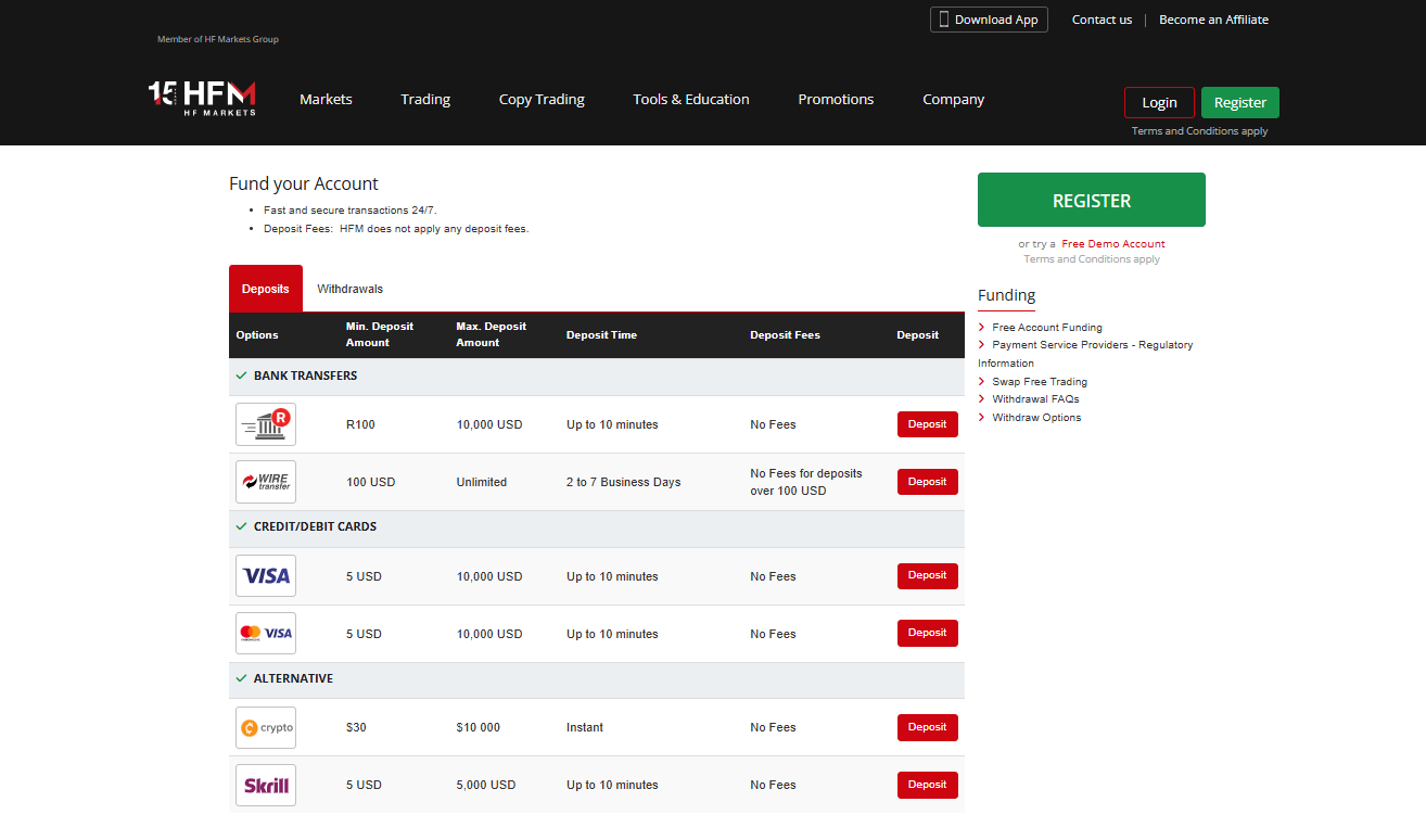 HFM provides several reliable deposit options, including Bank Transfers, Debit/Credit Cards, and Crypto.