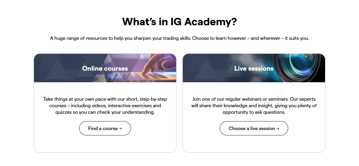 IG provides a wealth of educational resources, including articles, videos, tutorials, webinars, and forex courses. These resources are designed to help traders improve their knowledge and skills in the financial markets.