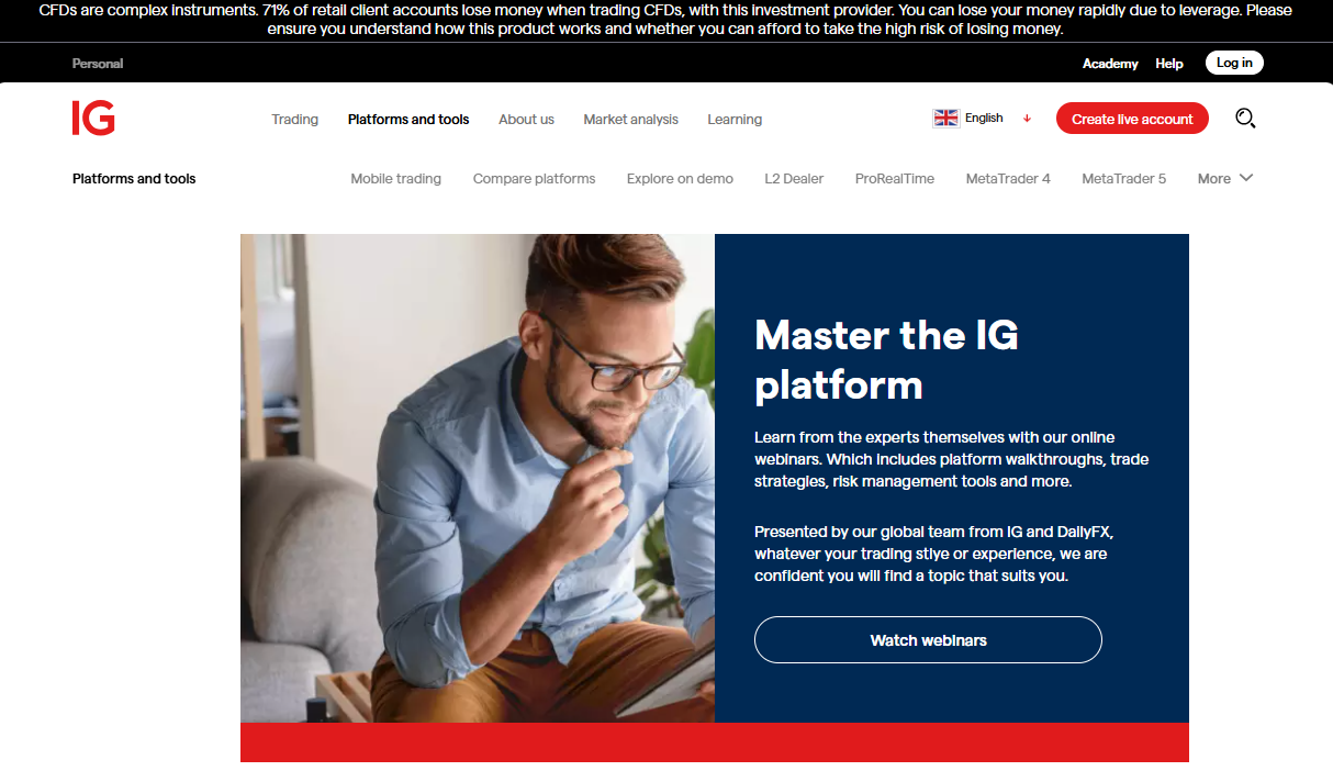 | Trading Platforms | MT4 IG Platform ProRealTime |