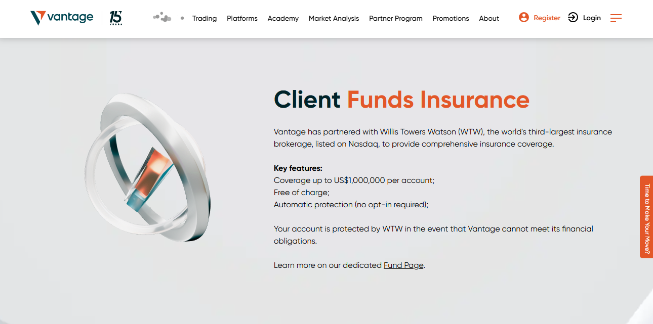 Vantage는 1등급 금융기관의 분리된 은행 계좌를 사용하여 고객 자금을 보호하며, Willis Towers Watson을 통해 계좌당 최대 1,000,000 USD의 전문 배상 책임 보험으로 보장됩니다. 이러한 보호 장치는 회사의 파산 시 거래자에게 강력한 보장을 제공합니다.