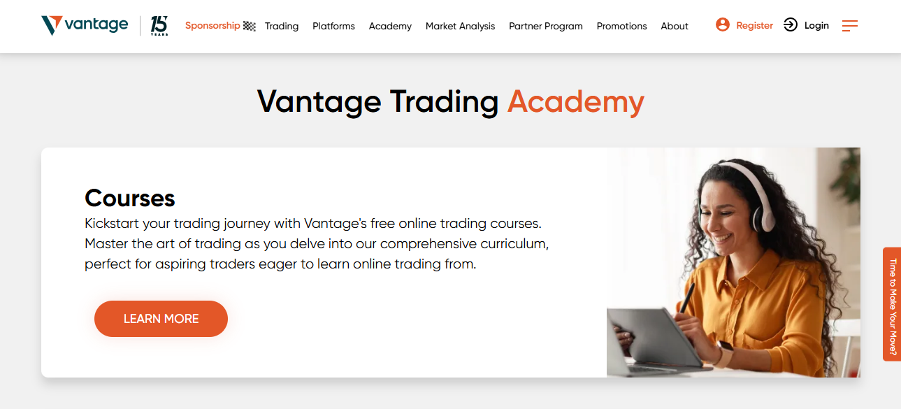 Vantage Academy는 모든 경험 수준의 트레이더를 위해 설계된 강력하고 사용자 친화적인 교육 허브입니다. 무료로 제공되는 고품질 콘텐츠에 대한 접근을 제공하며, 이는 더 스마트하게 거래하고 지속적으로 성장하고자 하는 모든 사람에게 귀중한 리소스입니다.