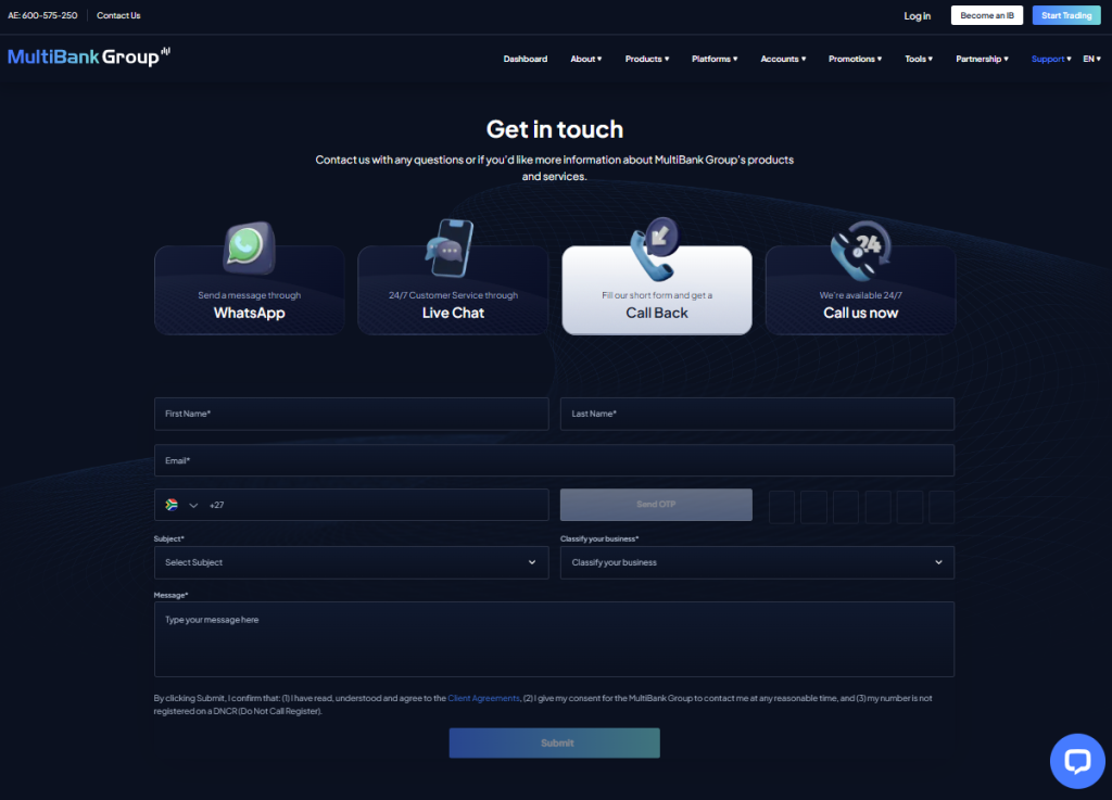 MultiBank Group delivers comprehensive customer support via live chat, WhatsApp, phone, and callback requests. Available 24/7, these channels ensure traders and partners receive prompt, professional, and accessible assistance for any product or service query.