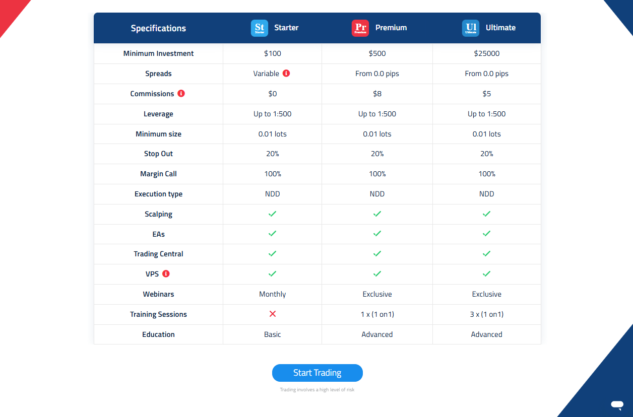 Beginners can start with the Starter or Demo account. These accounts provide low entry costs, basic education, and monthly webinars to help new traders understand markets and develop trading strategies before progressing to advanced accounts.